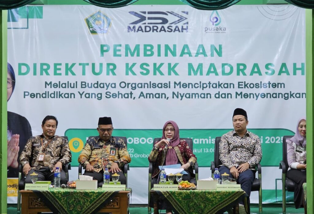 Purwodadi, Kementerian Agama Republik Indonesia sedang gencar mewujudkan program madrasah aman, nyaman, dan menyenangkan. Tujuannya adalah untuk menciptakan lingkungan pendidikan yang kondusif tanpa gangguan bagi seluruh siswa madrasah di Indonesia. Dalam upayanya tersebut Direktur Kurikulum, Sarana, Kelembagaan, dan Kesiswaan (KSKK) Madrasah Kemenag RI, Prof. Dr. Hj. Nyayu Khodijah, S.Ag., M.Si. hadir di Kabupaten Grobogan untuk memberikan pembinaan kepada seluruh kepala MTs dan MA yang ada di Grobogan.