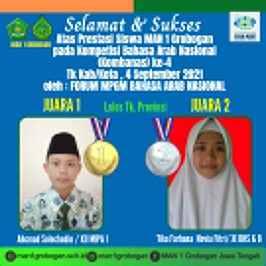 Purwodadi – Prestasi kembali di raih oleh siswa-siswi MAN 1 Grobogan. Kali ini dua siswa MAN 1 Grobogan yaitu, Achmad Solechudin dan Tika Farhana Novia Fitri meraih juara I dan juara II dalam Kompetisi Bahasa Arab Nasional (KOMBANAS) ke-4 tingkat Kabupaten Grobogan yang diselenggarakan oleh forum MGMP Bahasa Arab Nasional (4/9).