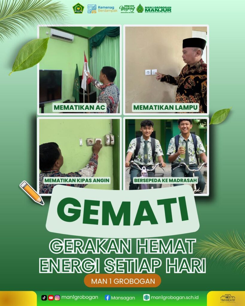 Mansagan News -Komitmen Madrasah Aliyah Negeri (MAN) 1 Grobogan dalam menumbuhkan budaya peduli lingkungan kembali ditegaskan melalui sebuah gerakan edukatif bertajuk GEMATI (Gerakan Hemat Energi Setiap Hari). Gerakan ini menjadi salah satu langkah nyata madrasah dalam mengajak seluruh warga madrasah untuk lebih bijak dalam menggunakan energi sekaligus mendukung program Madrasah Adiwiyata yang selama ini terus digelorakan.