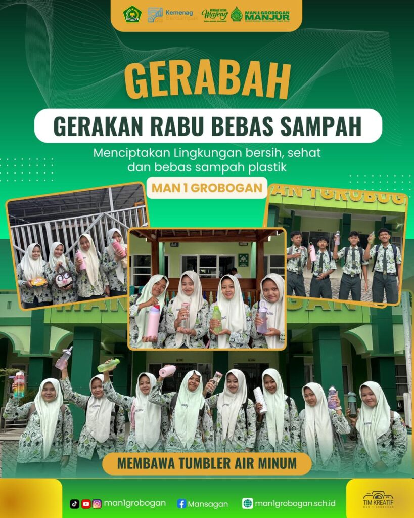 Mansagan News– Hari ini Rabu, 1 April 2026, menjadi Rabu yang kesekian kali berbenah dan semangat menjaga lingkungan terus digelorakan oleh keluarga besar MAN 1 Grobogan melalui berbagai program nyata. Salah satu gerakan yang kini menjadi budaya madrasah adalah GERABAH (Gerakan Rabu Bebas Sampah), sebuah inisiatif yang mendorong seluruh warga madrasah untuk lebih peduli terhadap kebersihan dan kelestarian lingkungan.