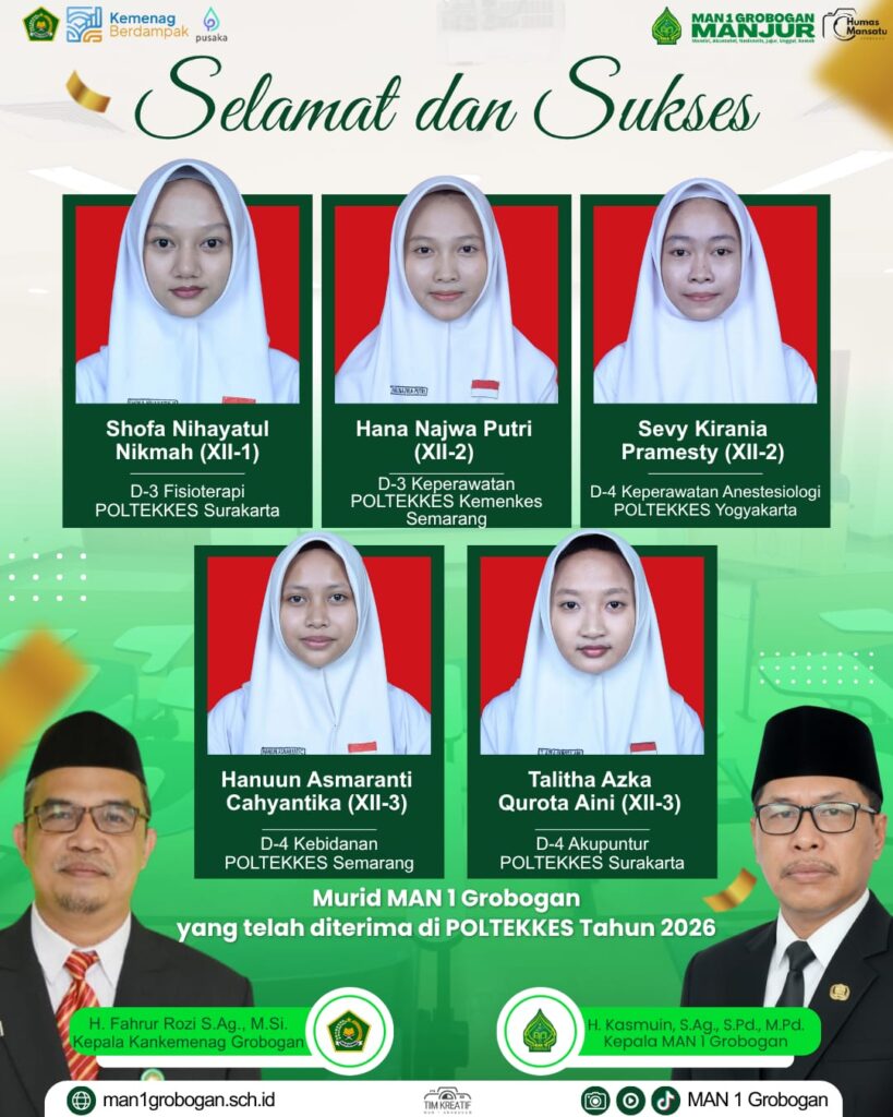 Mansagan News – Awal April 2026 menjadi momen yang penuh kebahagiaan bagi keluarga besar MAN 1 Grobogan. Di tengah suasana yang masih hangat pasca Idulfitri, kabar menggembirakan datang dari para murid kelas XII yang berhasil menorehkan prestasi membanggakan di bidang pendidikan tinggi kesehatan.