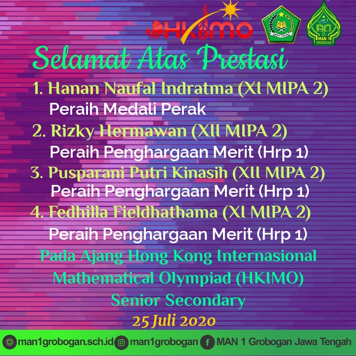 Berdasarkan pengumuman panitia secara online, Ahad, (9/8), lagi siswa MAN 1 Grobogan ini meraih medali Perak pada seleksi nasional Hong Kong International Mathematical Olympiad (HKIMO 2020) yang laksanakan Daring pada tanggal 25 Juli 2020. Dengan meraih medali perak Hanan berhak melaju level internasional yang akan dilaksanakan pada tanggal 29 Agustus 2020.