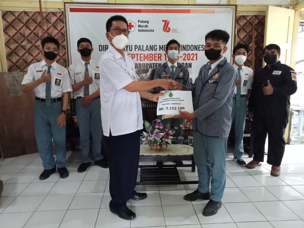 Donasi dari OSIS MAN 1 Grobogan diterima secara langsung oleh Djasman, Kepala Markas PMI Kab. Grobogan di Kantor PMI Kab. Grobogan. Djasman sangat mengapresiasi donasi yang dilakukan oleh OSIS MAN 1 Grobogan untuk korban erupsi Gunung Semeru.